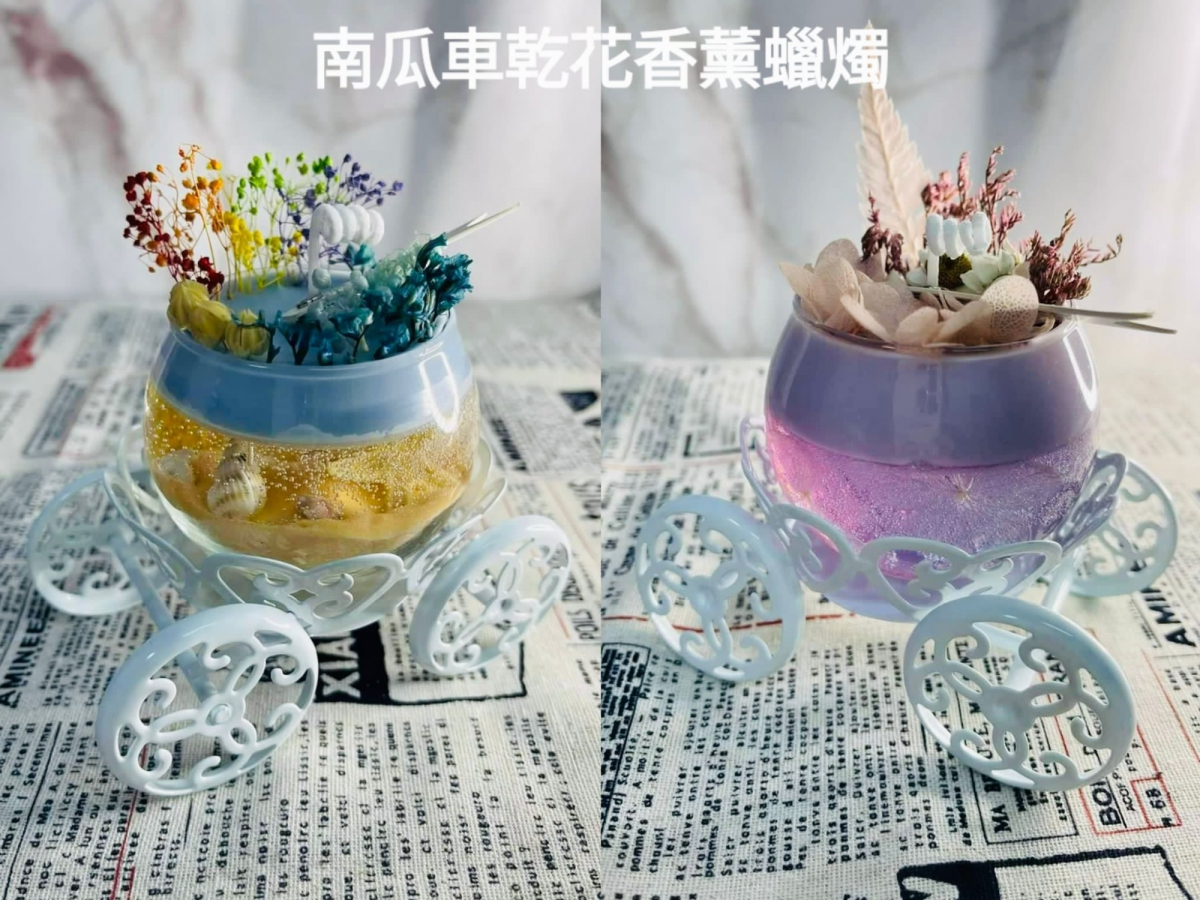 南瓜車襯托香薰蠟燭,真係非常之靚,有不同顏色花材,精油選擇,自己設計返一個獨一無二屬於自己嘅南瓜車。
