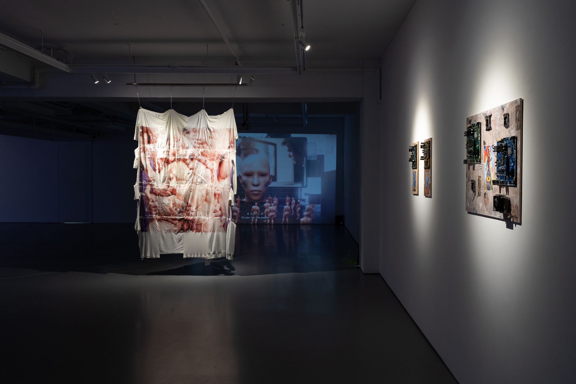一陣陣微弱的喧鬧聲從玻璃屏風後方傳出。《虛空的虛空》(2024) 由一組三維全息投影風扇和多聲道原聲帶組成,是藝術家對《萬試萬靈》收集到的數據進行視聽上的重新編排。被拆解的人工智能裝置骨幹殘骸作為結構基礎,其中的元件組裝方式,讓人聯想起一部被解剖的電腦結構。懸浮的顯示器上,接續播放著一連串看似隨機的影像——來訪者於駐留期間奉上他們已刪除的相片,以換取廖的人工智能指導。當喃喃細語的莫名聲音滲透在周圍的空間裡,這個裝置讓人同時聯想起神社及數據庫,在此,昔日的禱告得以永續長存。
