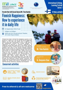 芬蘭連續七年被聯合國世界幸福報告評選為全球最幸福的國家,芬蘭的幸福秘訣是什麼?在9月24日(星期二)下午3時至5時,由香港都會大學李嘉誠專業進修學院院長曾德源博士主持、芬蘭駐港澳總領事高天明(Timo Kantola)分享的沙龍裡,將揭秘芬蘭的生活方式,包括工作與生活的平衡、親近自然、社區生活與人際交往的方式,以及芬蘭教育情況。