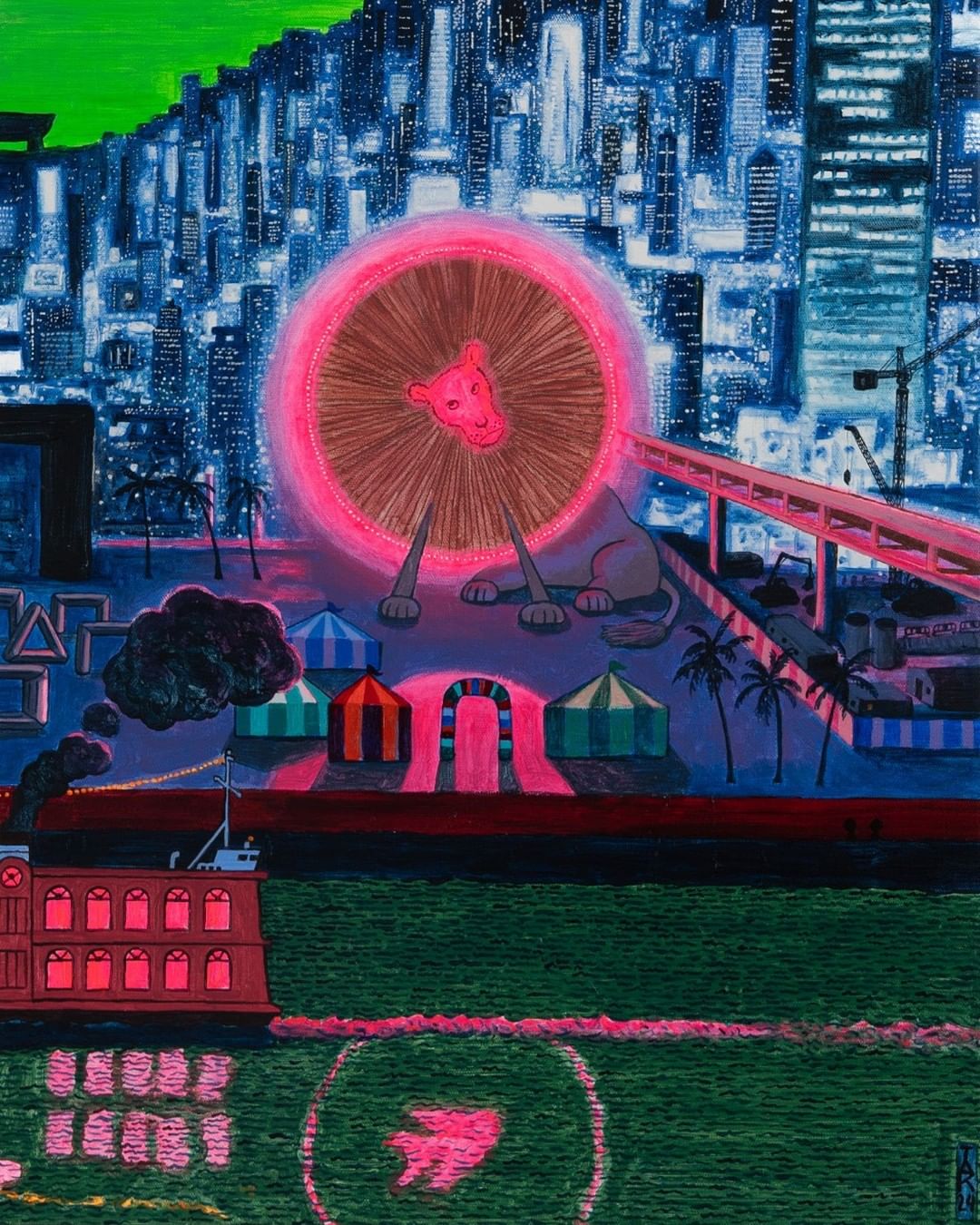 在「老地方見」中,《隱約聽到Auld Lang Syne》(2024)等大型畫作代表了楊學德繪畫風格在近年的轉向:更為透亮明媚的色譜,及更為平整順滑的繪畫表面。飽滿潔淨的構圖通過有超現實意味的元素將經典香港風景浪漫化,鋪陳了有懷舊意味的獨特敘事。在多幅相對小尺幅的作品中,楊學德再次關注了友誼和家庭等主題,並細心刻劃了以怪誕方式介入日常生活的奇異角色。《老婆抌晒我啲高達》(2024)講述了楊學德常回顧的主題:老去的高達和青春。畫面中的高達和渣古均已被趕出家門,在殘陽中無所事事。《少獅隊》(2023)及《街訪》(2024)描繪了在不同狀態中的獅崽:前者中的可愛舞獅孩童筋疲力盡蹲坐著休息,而後者中的大腹便便獅子則無精打采、迷茫過活。