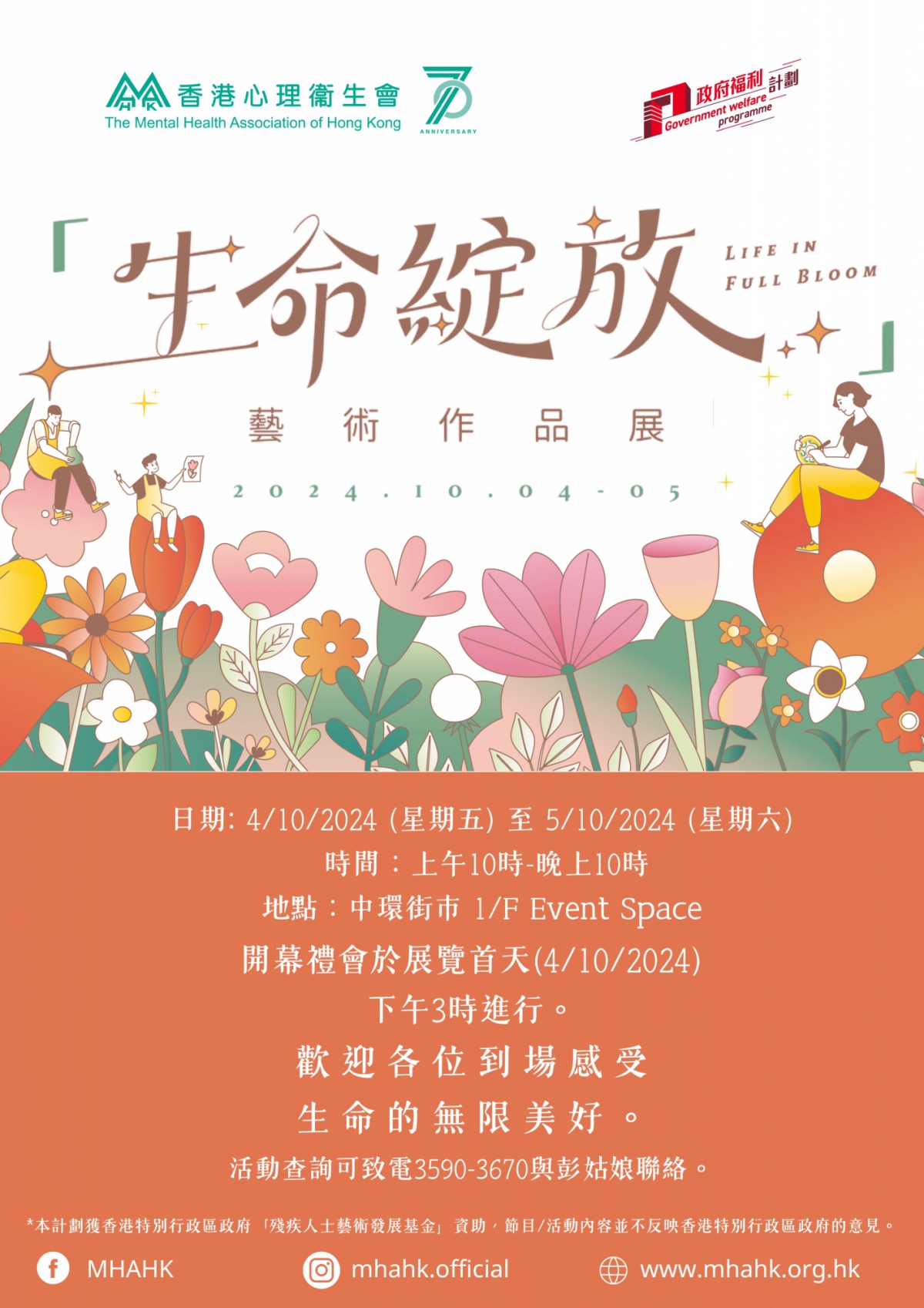 承蒙殘疾人士藝術發展基金資助,本會在過去五年為復元人士及智障人士提供多元化的藝術培訓。為展示服務使用者的創作及表揚他們在藝術的成就,本會將於2024年10月4至5日舉行為期兩天的藝術作品展。是次活動目的是讓市民更深入了解殘疾人士的藝術潛能和才華,並感受到他們在創作過程中面對的挑戰,以及他們如何以獨特的視角呈現藝術。