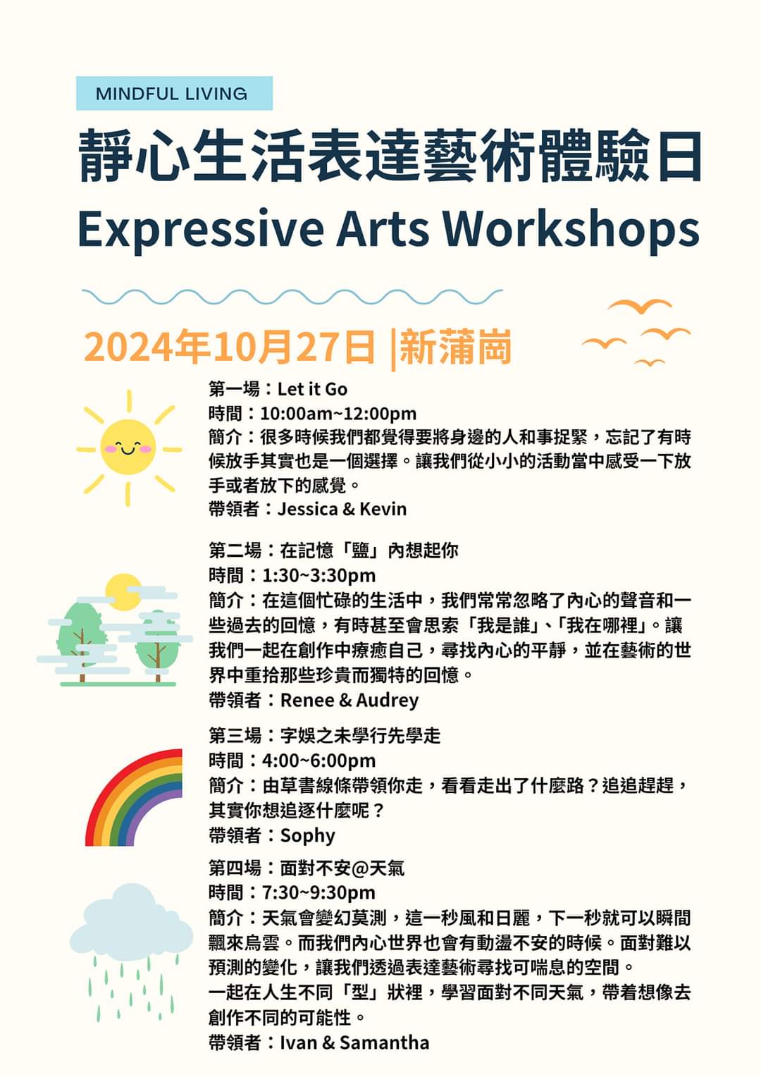 天氣會變幻莫測,這一秒風和日麗,下一秒就可以瞬間飄來烏雲。而我們內心世界也會有動盪不安的時候。面對難以預測的變化,讓我們透過表達藝術尋找可喘息的空間。