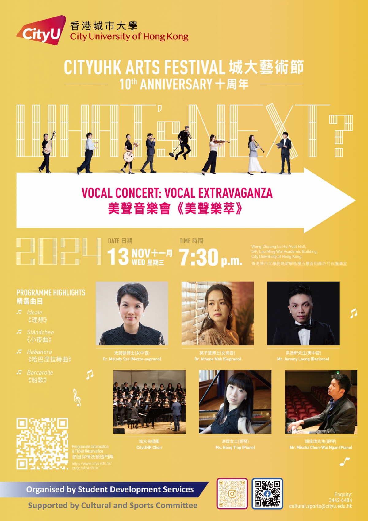 一眾著名聲樂家以細膩的聲線與觀眾踏上優美的美聲之旅。本地女中音史韶韻博士、女高音莫子慧博士、男中音梁浩軒先生及城大合唱團,將為觀眾精選充滿愛與熱情的聲樂作品,慶祝《城大藝術節》十週年。