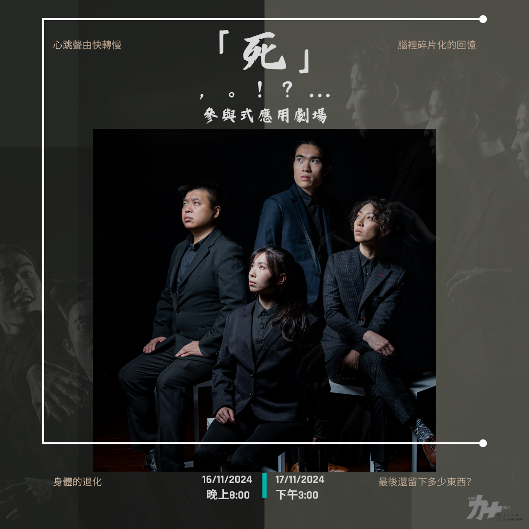 「死,。!?...」參與式應用劇場首演反應熱烈,現再加開二場演出! 座位有限,先到先得!心跳聲由快轉慢、腦裡碎片化的回憶、身體的退化,最後還留下多少東西?由我們變成我,由起點到終點,我還剩下什麼?有沒有後悔?臨終前、死亡後,儀式做什麼?著什麼衫?場地如何佈置?請什麼人來?我們有選擇嗎?一位殯儀策劃師,帶同三個和死亡擦身而過的人,從醫療、殯葬和生死裡,思考死亡帶來的意義。