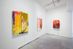 Exuberant colours, cadent sounds and dazzling lights manifest as an immersive environment. Retaining only the placebo of planarity, striking neon tones, gestural brush strokes and layered surfaces combine into mixed-media compositions. These deconstructed picture planes transcend the objecthood of artworks with the simplest of gestures: visible and audible wavelengths embrace the paintings, reverberate in unison and collide in the spectatorial perception. Citing his exhibition Techno Zen at the 60th Venice Biennale, Nemes continues to dissect sound frequencies into low, mid and high ranges, while dividing light information from the visible spectrum into three interwoven realms. Nemes, fascinated by pink not existing on the visible spectrum but resulting from the brain mixing colours, indirectly points to the subjective nature of perception and the brain's role in constructing realities, highlighting reciprocity between physical phenomena and cognitive interpretation. Inspired by techno music and rave culture, Nemes explores sensory experiences through art.