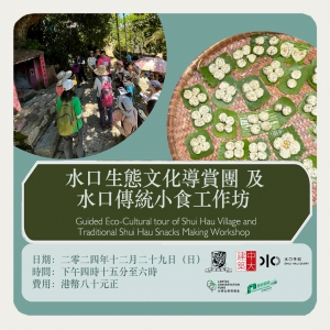 行程從水口導賞團開始,走遍這個有 400 年歷史的沿海村莊,講述水口的傳統建築、民間信仰、祭祀活動以及生態環境。水口位於群山之間,擁有豐富的傳統文化,農業活動曾是村民生計的重要部分。 水口傳統小食工作坊 參加者將使用來自南大嶼的食材和傳統食譜製作小食,例如雜糍、茶粿及涼茶等。這些食譜反映了水口傳統村莊生活中的農務特色。工作坊將由當地村民指導,並使用世代相傳的食譜。*參與者需年滿12歲以上。
