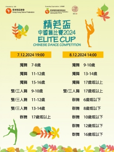 為慶祝北京舞蹈學院「中國舞等級考試課程」在港推行35周年及提昇中考導師的編創技巧及學生演繹水平,本會將於今年舉辦精英盃中國舞比賽2024,賽程包括:獨舞、雙人或三人舞及群舞,讓曾參加該課程考試的老師和同學們在交流學習的過程中更有效益的成長。本比賽獲北京舞蹈學院考級院支持,並由北京舞蹈學院考級院考官擔任評判。