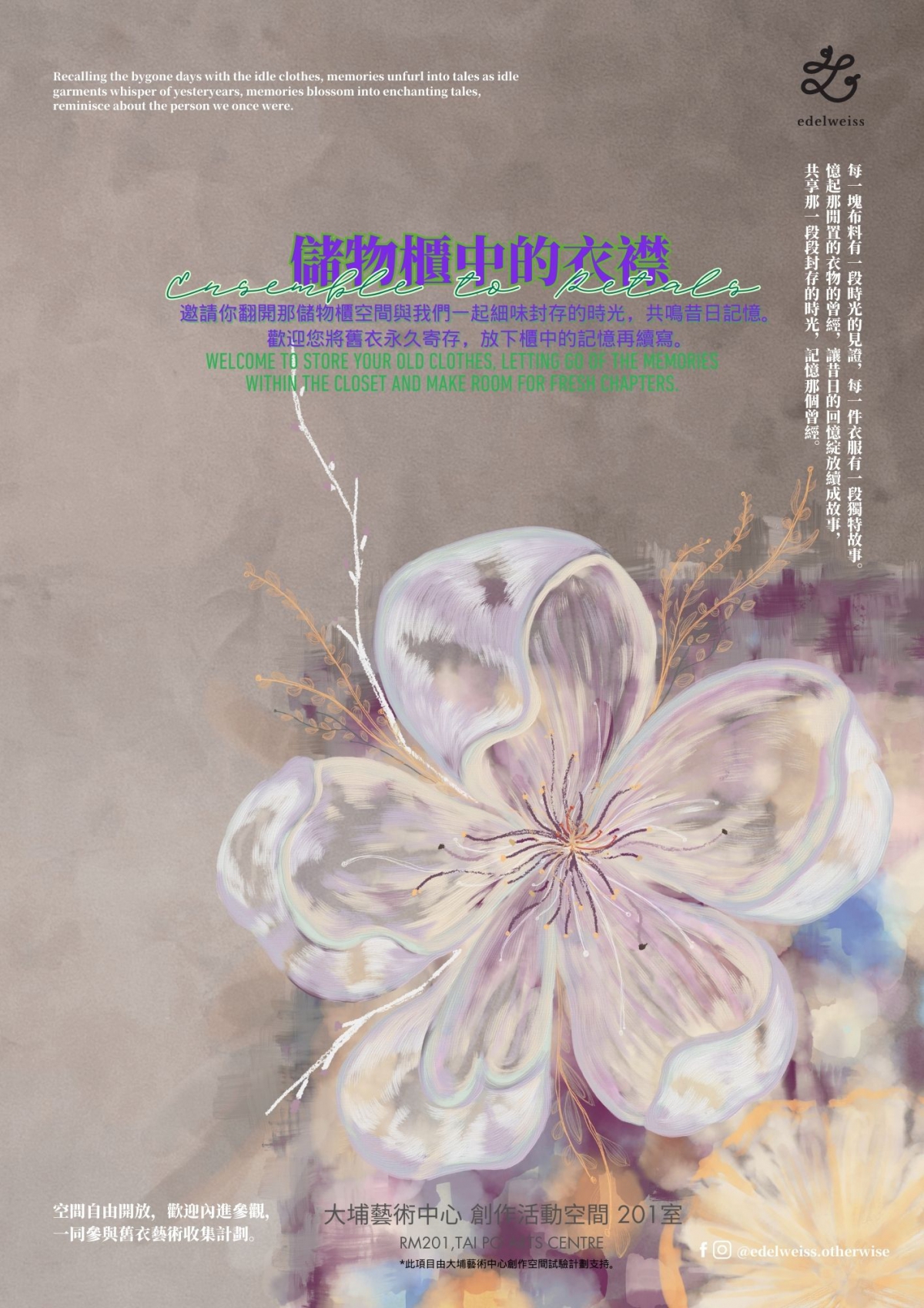 每一塊布料有一段時光的見證,每一件衣服有一段獨特故事。憶起那閒置的衣物的曾經,讓昔日的回憶綻放續成故事,共享那一段段封存的時光,記憶那個曾經。邀請你翻開那儲物櫃空間與我們一起細味封存的時光,共鳴昔日記憶。歡迎您將舊衣永久寄存,放下櫃中的記憶再續寫。空間自由開放,歡迎內進參觀,一同參與舊衣藝術收集計劃。