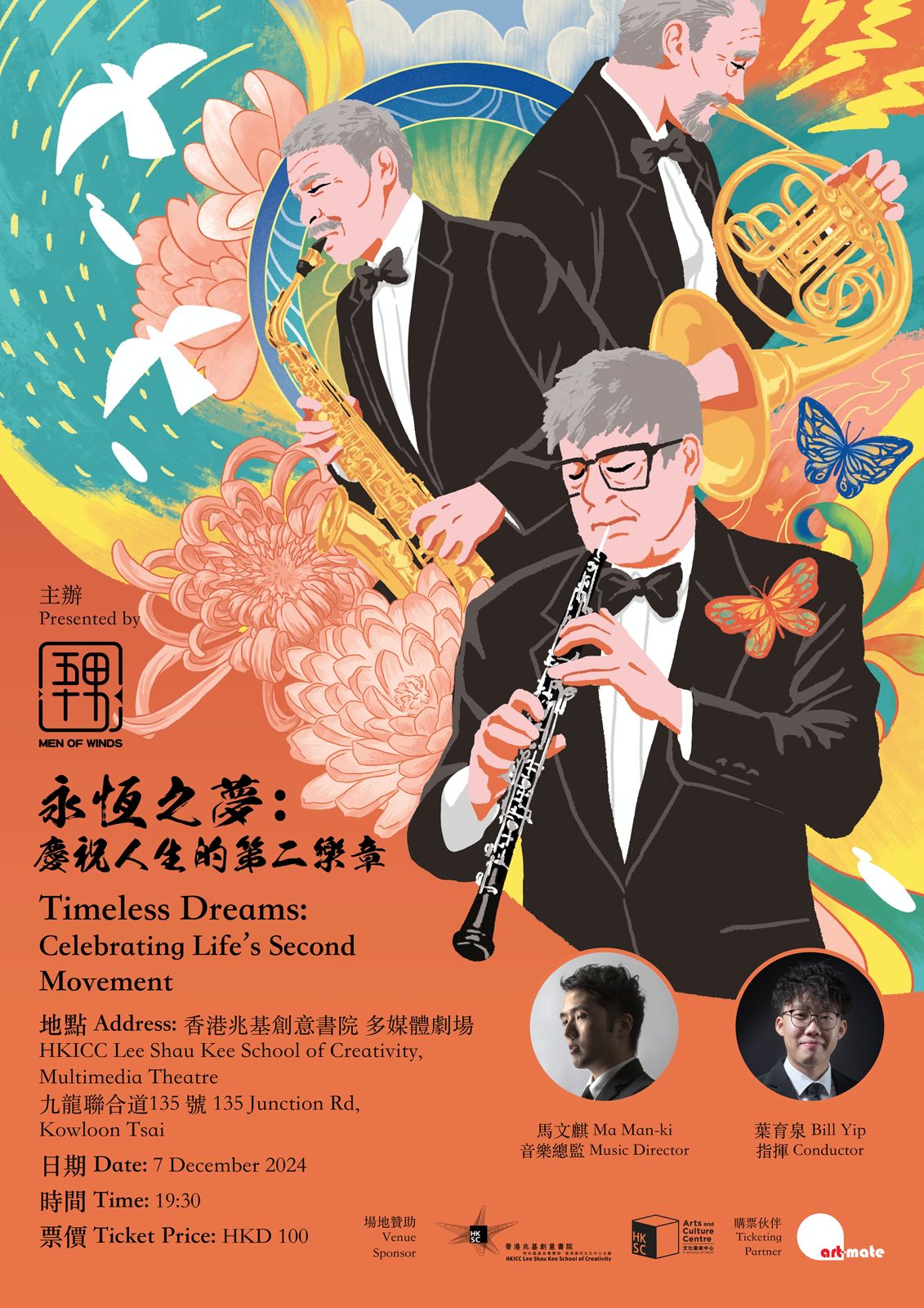 歡迎蒞臨「永恆之夢:慶祝人生的第二樂章」,這場特別音樂會標誌著「五十男樂團」成立五週年。「五十男樂團」成立於2019年,是一個由退休男士組成的管樂團,我們將音樂視為黃金歲月中充滿活力的一部分。今晚,我們不僅慶祝我們的音樂旅程,更要頌揚那不分年齡的永恆夢想精神。我們的曲目涵蓋從經典電影配樂到當代作品,每一首樂曲都反映了我們團員豐富的人生經歷。讓我們一同展示,退休並非終點,而是人生這場偉大交響曲中和諧的新樂章。