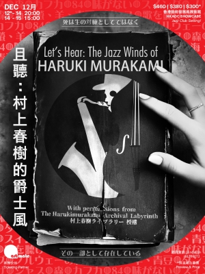 「且聽:村上春樹的爵士風」獲Harukimurakami Archival Labyrinth授權,一眾爵士樂手夥拍本地劇場人,聯手打造香港藝術發展局展藝館(SHOWCASE)成爵士俱樂部!音樂會以爵士樂標誌性的自由氛圍及即興獨特演奏,配合現場說書演繹及影像投影,與每位來賓分享多首啓發自村上春樹的爵士風作品,重塑書中意境。