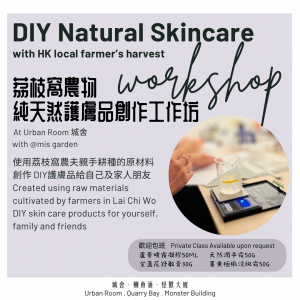 您將學習如何使用來自香港荔枝窩當地農民的新鮮原材料,自製護膚產品。這個工作坊非常適合對天然美容、可持續發展以及支持本地農業感興趣的人士。