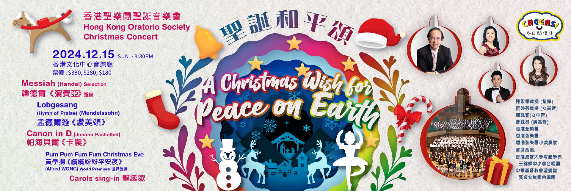 在這動盪的時代,戰爭的陰影籠罩全球,我們渴望和平的曙光。孟德爾頌《讚美頌》中那句「黑夜已逝去」正是我們的心聲。香港聖樂團誠摯邀請您參加「聖誕和平頌」音樂會,透過美妙的樂章,讓我們共同迎接希望與光明。全新編曲的《繽繽紛紛平安夜》將帶給您耳目一新的感受,傳遞喜樂與和諧。讓我們在這個特別的節日,以音樂連結彼此,祈願世界和平。