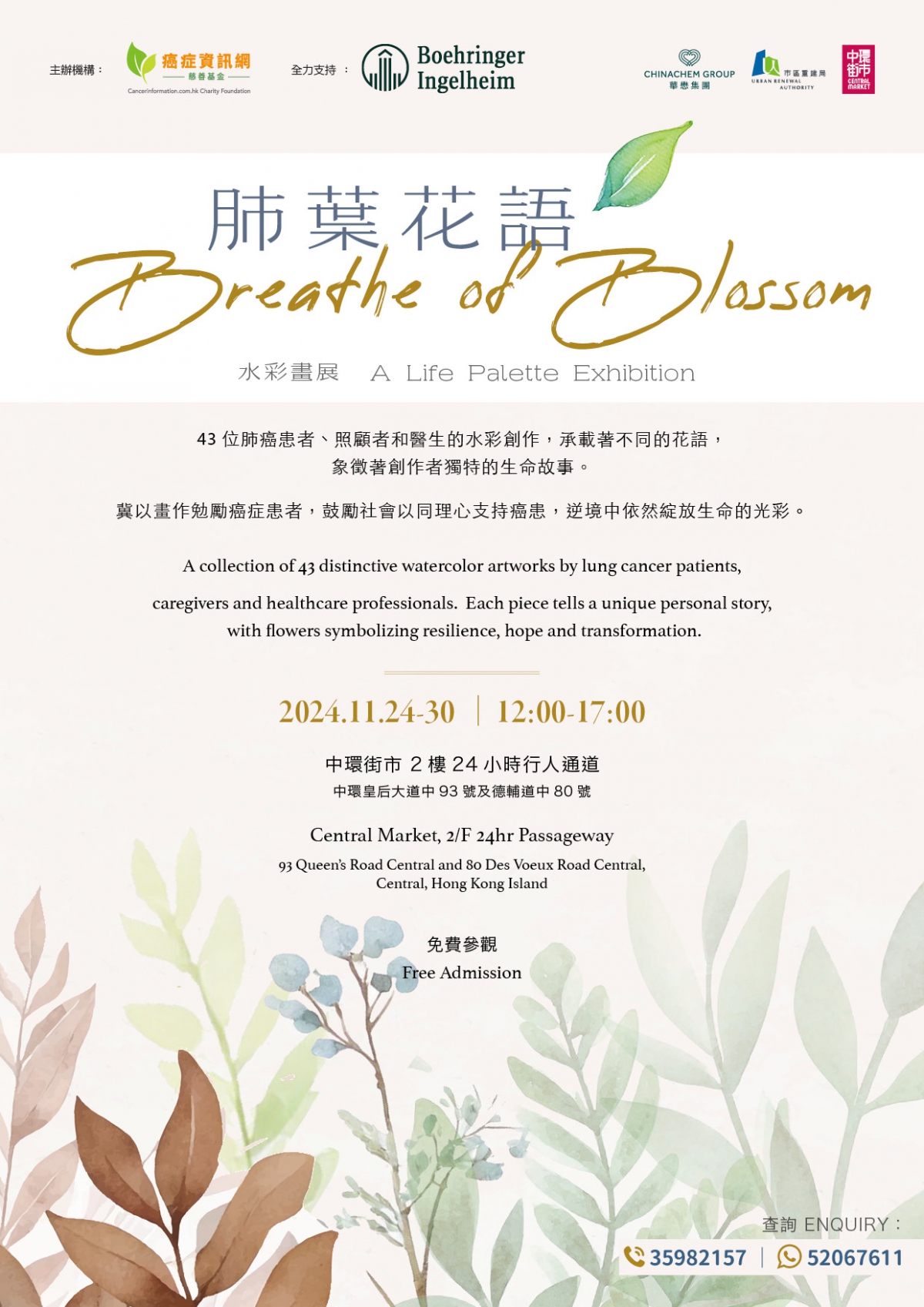 《肺葉花語—水彩畫展》展出來自43位肺癌患者、照顧者和醫生的創作,作品承載著不同的花語,象徵著創作者獨特的生命故事,以及他們在生命歷程中的起伏與堅持。作品不僅展現了他們在面對困境時的堅強意志,也流露出對生命的熱愛與期待。展覽旨在提高公眾對肺癌的關注,亦冀以畫作勉勵癌症患者,鼓勵社會以同理心支持癌患,讓他們在逆境中依然綻放生命的光彩。我們誠邀您放慢腳步,走進肺癌患者及照顧者的內心世界,感受當中的真摯情感,編織一個更有溫度的社會。