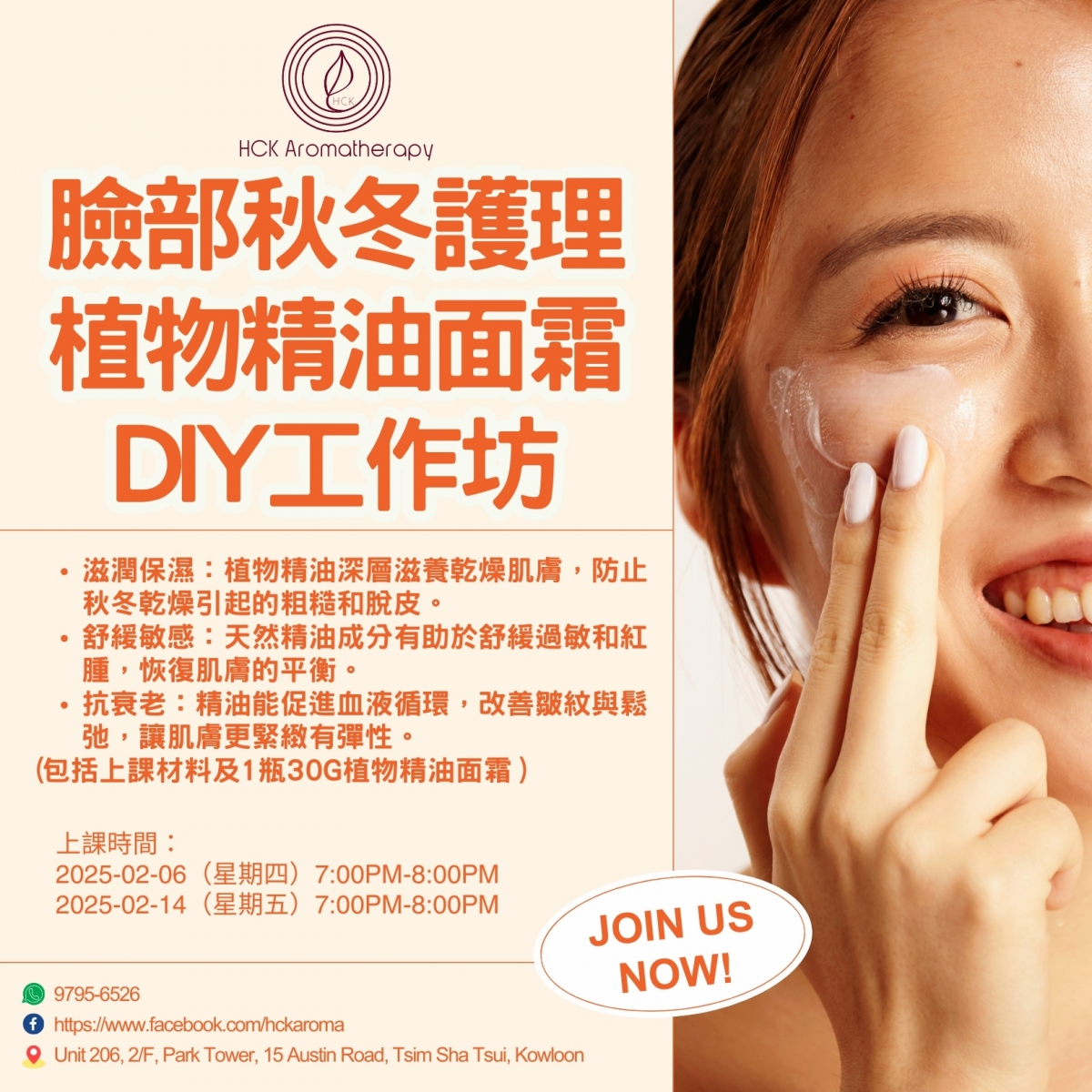 滋潤保濕:植物精油深層滋養乾燥肌膚,防止秋冬乾燥引起的粗糙和脫皮。舒緩敏感:天然精油成分有助於舒緩過敏和紅腫,恢復肌膚的平衡。抗衰老:精油能促進血液循環,改善皺紋與鬆弛,讓肌膚更緊緻有彈性。親手製作專屬的天然精油面霜,一起探索天然精油的奇妙力量,呵護你的每一寸肌膚。( 包括上課材料及1瓶30g植物精油面霜 )