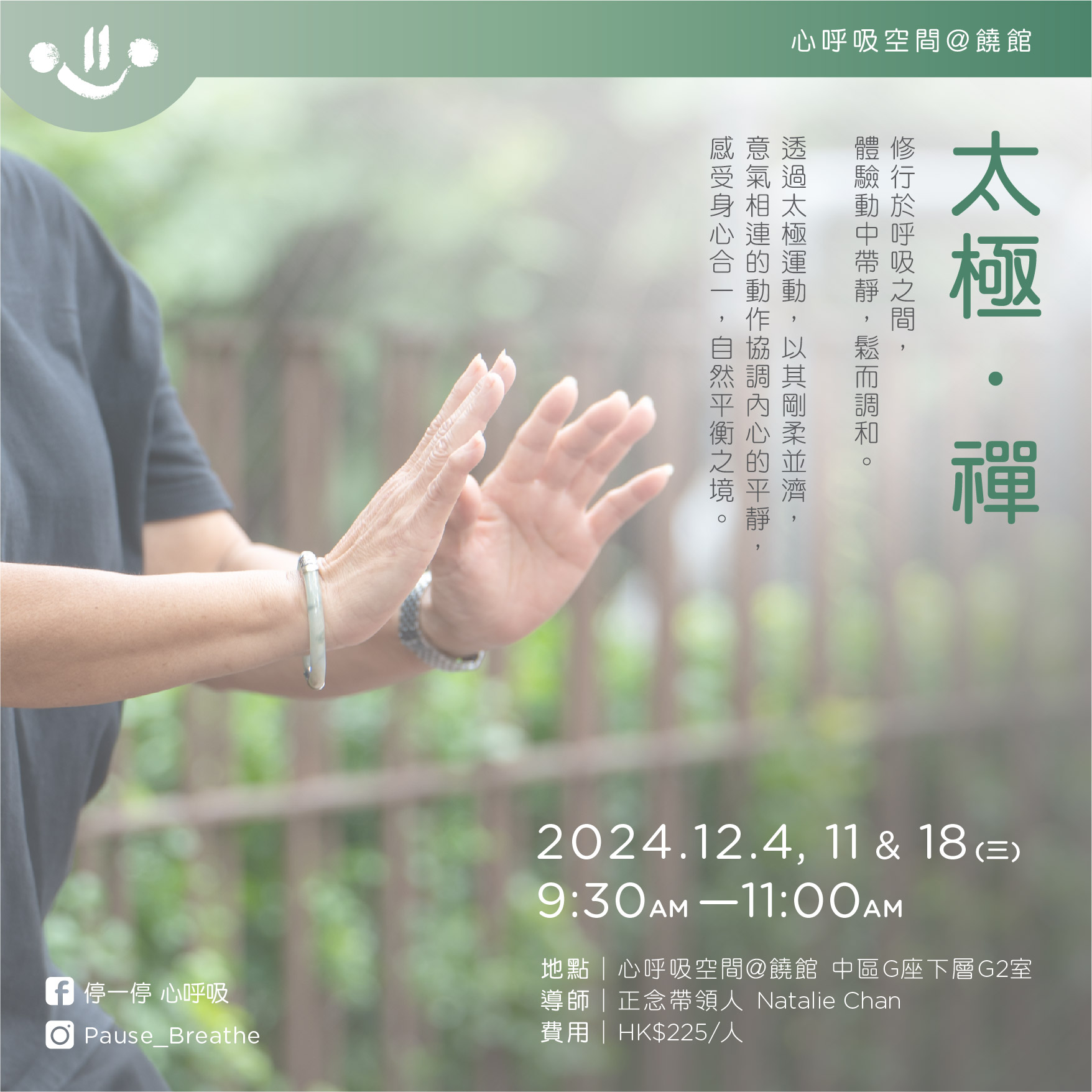 修行於呼吸之間,體驗動中帶靜,鬆而調和。透過太極運動,以其剛柔並濟,意氣相連的動作協調內心的平靜,感受身心合一,自然平衡之境。