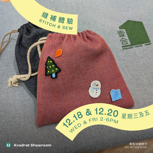 又來到一年的尾聲,是時候為親朋好友準備一點聖誕小心意,或許為自己好好整理一下今年的點滴。壹合聯同Kvadrat (丹麥紡織品牌),專門為大家準備了兩場抽繩袋製作工作坊,「上環補補」成員們為大家裁剪準備好Kvadrat精美的布料,參加者只需要進行簡單縫紉,還可以即席選擇刺繡圖案勳章,就能完成一個獨一無二的抽繩袋。