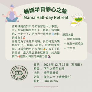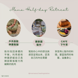 年尾除了是回顧過往一年的機會,還可以為新一年的展望定下清晰的目標與方向。透過願景圖製作能幫助你心中的想法與感受呈現出來,認清自己的內在需要;放鬆伸展瑜伽,助你找回身體的平衡,利用柔和伸展舒緩自己長期因緊張壓力而繃緊的肌肉;享受用心製作的料理,豐富我們的味蕾;透過互相分享圍爐,幫助我們尋回自我療癒能力,重新看見自己作為媽媽的活力。