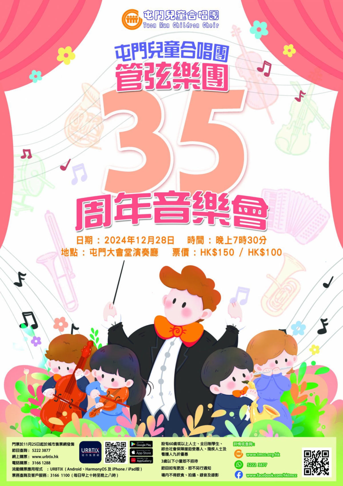 屯門兒童合唱團管弦樂團35周年音樂會將於2024年12月28日晚上7時30分於屯門大會堂演奏廳舉行啦!門票分$150及$100,將於11月25日開始係城巿電腦售票網開賣啦!團員們都為左今次既演出不辭勞苦咁練習。當然唔少得既仲有我地既合唱小樂苗和舊團員再次一同演出,而且,更有為今次周年音樂會而創作既世界首演全新作品!大家千祈唔好錯過呀!約定大家!12月28日晚上7時30分屯門大會堂演奏廳見啦!