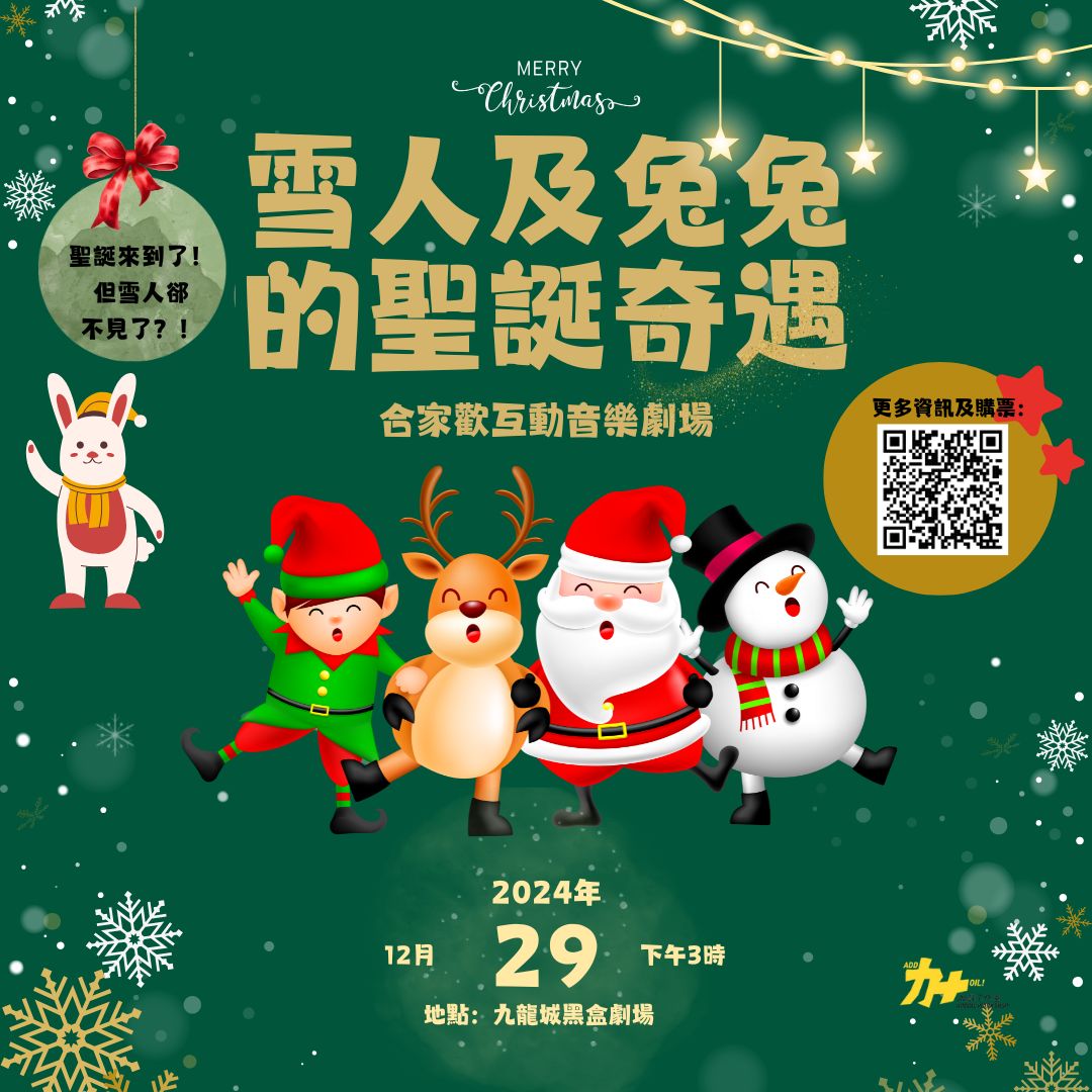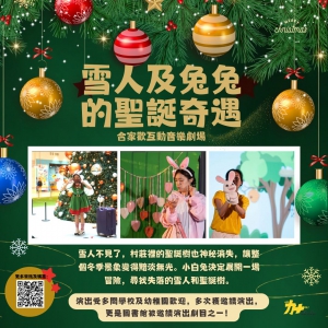 合家歡互動音樂劇場《❄️雪人及兔兔的聖誕奇遇🎄》雪人⛄不見了!而且不僅如此,村莊裡的聖誕樹🎄也神秘消失,讓整個冬季景象變得黯淡無光。小白兔決定展開一場冒險🗺️,尋找失落的雪人和聖誕樹。👶適合對象:本節目適合3歲或以上人士觀看⏰節目全長:約1小時🌟演出設有大量的互動成份,孩子能夠與演員一起享受舞台的樂趣!🌟演出受多間學校及幼稚園歡迎,多次獲邀請演出,更是圖書館被邀請演出劇目之一!快來一起參加這場充滿歡樂與冒險的聖誕奇遇吧!