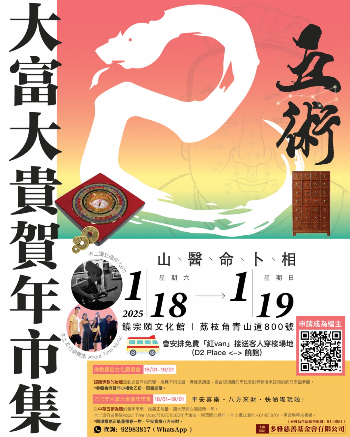 以中華五術為題的賀年市集,推廣正能量,讓大眾開心迎接新一年。 本土流行曲樂隊About Time Music於18/01以80年代金曲,與眾開心過年,本土獨立唱作人611於19/01,用音樂帶來喜樂。