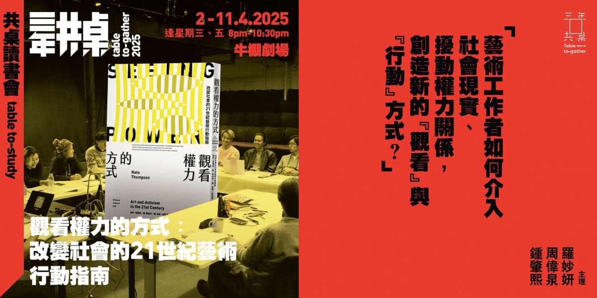 今次共桌讀書會將會以納托.湯普森的《觀看權力的方式:改變社會的21世紀藝術行動指南》作為研讀書本,在一連四晚的讀書會中,深入剖析當代藝術背後錯綜複雜的政治、經濟、社會網絡;思考身處劇烈變動的時代,藝術工作者如何介入社會現實、擾動權力關係,創造新的「觀看」與「行動」方式。