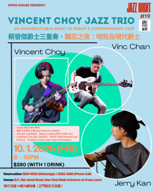 1月10日(星期五)才華洋溢嘅年輕結他手Vincent Choy將帶領嶄露頭角嘅年輕鼓手Jerry Kan,以及實力穩紮嘅低音結他手Vinc Chan一同演出,為大家帶來一系列Bebop同Contemporary曲目,大家敬請拭目以待!