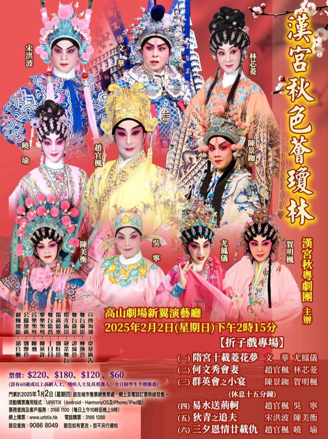 折子戲專場:( 一 ) 隋宮十載菱花夢( 二 ) 何文秀會妻( 三 ) 群英會之小宴( 四 ) 易水送荊軻( 五 ) 狄青之追夫( 六 ) 三夕恩情廿載仇