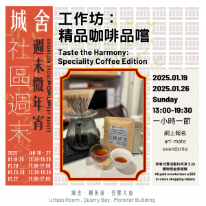這是一個一小時的品嚐活動,我們會學習基本精品咖啡知識及品嚐約三款特色精品咖啡。如你喜歡,咖啡師歡迎你參與磨豆的機會。歡迎來參加我們在社區舉行的休閒特色咖啡品嚐活動。這是個嘗試不同咖啡的好機會,還能與其他喜愛咖啡的人交流。這是城舍Pop-up 系列活動之一。