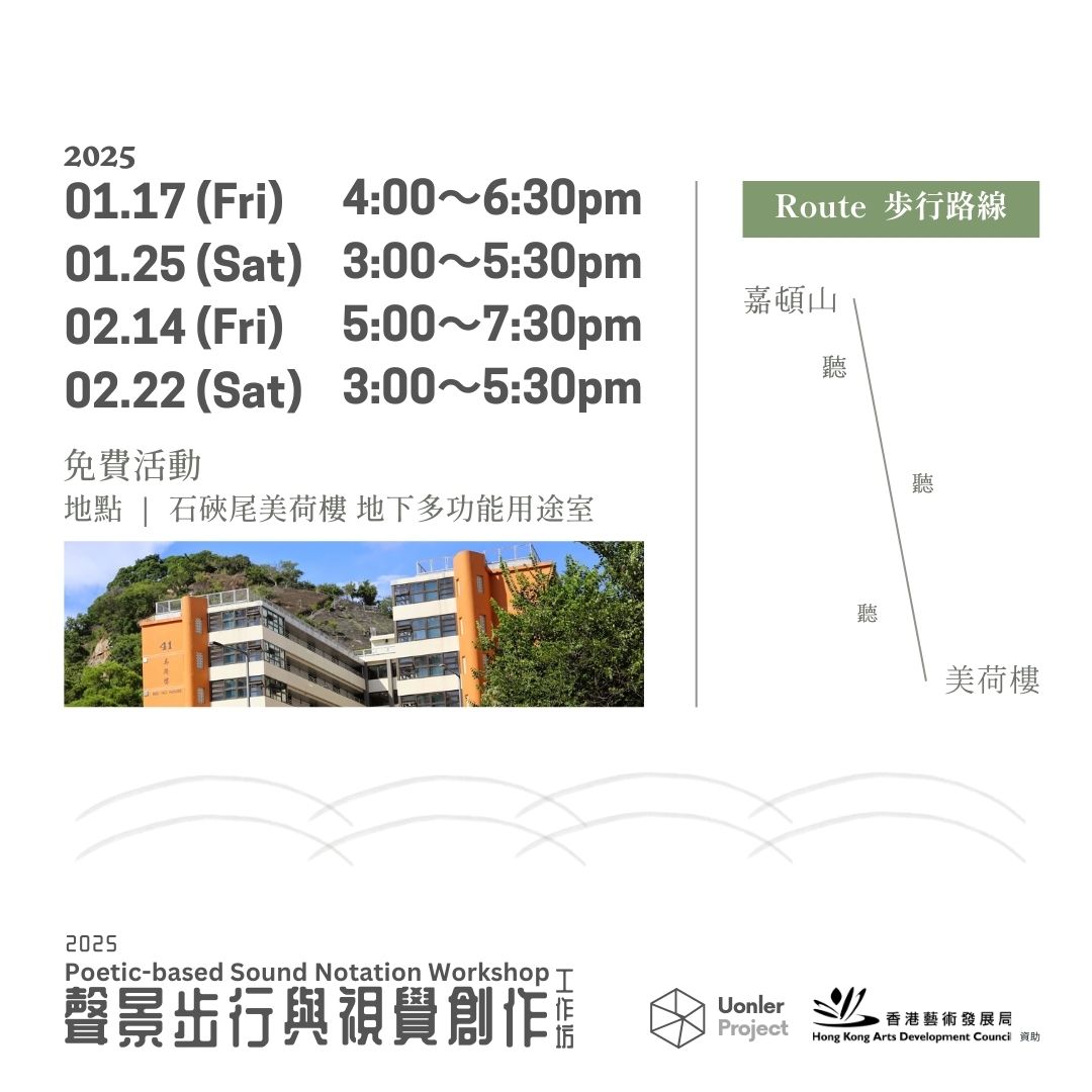 藉著活動,參加者會漫步深水埗嘉頓山與美荷樓附近,體驗環境空間存在的各種聲音,體驗深度傾聽,探索城市與自然環境中的各種聲音,尋找地方與環境容易忽略的符號,以此為創作題材,運用創意書寫或繪畫出富詩意的聲音記譜和現代詩作。活動分別在室內及戶外進⾏,首先於活動室內,以講述及熱身遊戲帶領參加者認識聲音藝術概念、符號的轉化及視覺文字創作,然後帶領學生走出活動室到社區和大自然中,於過程中蒐集獨特的錄音及視覺素材。最後,運用「符號」及步行經驗的感受轉化為紙上的文字或藝術創作。