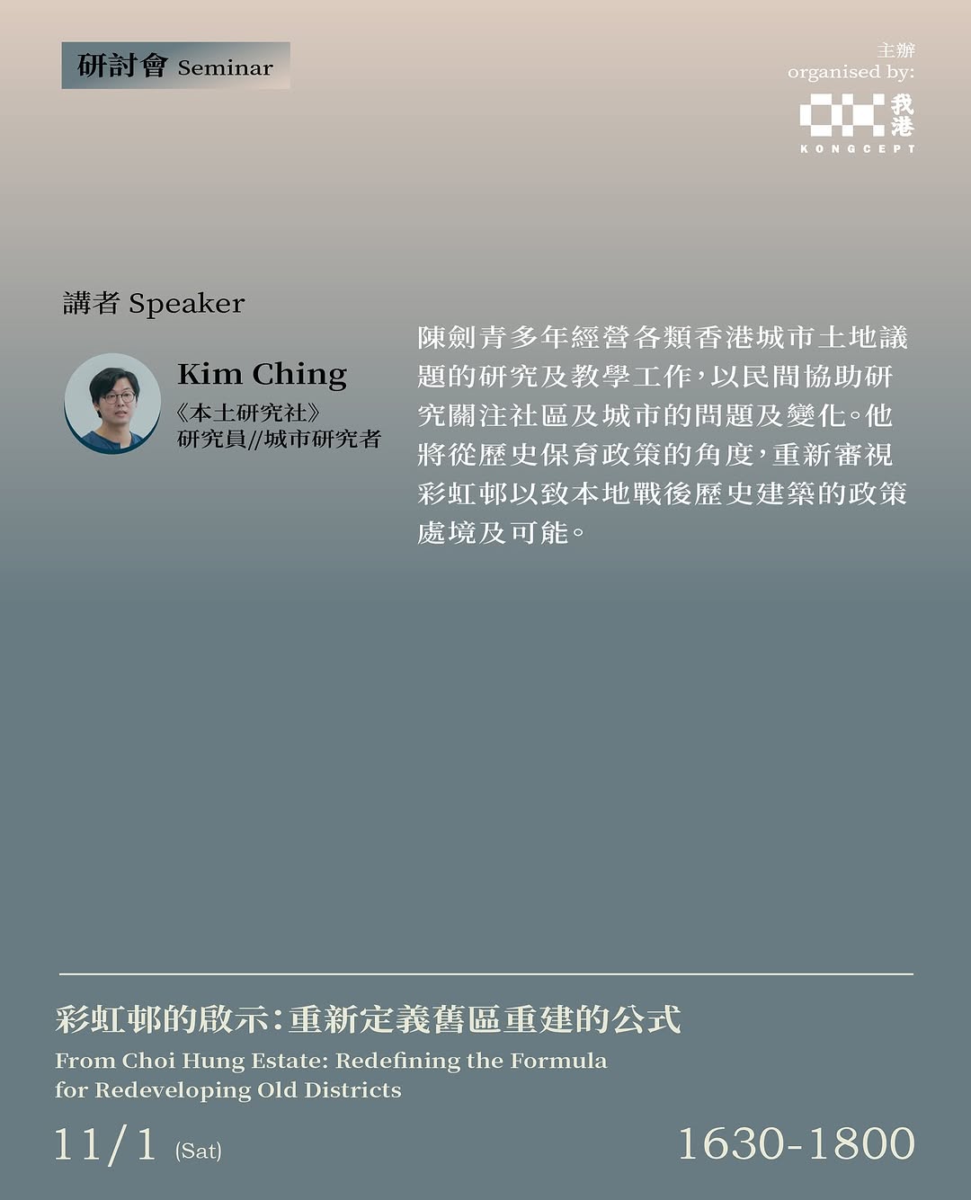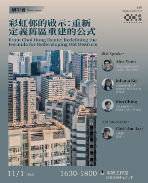 本次研討會邀請了研究現代建築的學者Alex、Juliana與城市研究者劍青,將以彩虹邨為起點,探討香港目前需要的舊區重建方向與政策;在思考如何將「保育」融入舊區重建的框架的同時,亦希望為未來十年陸續老化的公共屋邨構想一個可參考的藍圖。