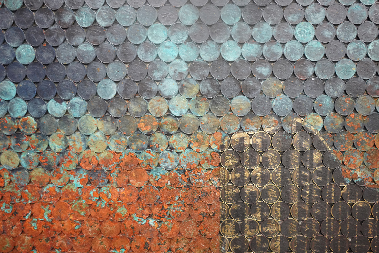 梁洛熙長期關注香港本土文化、建築與城市發展等議題,他其中一個最具代表性的系列以港元硬幣創作,透過化學藥水使硬幣加速氧化及變色,從而使部分硬幣生銹變黑,拼湊出香港多個依舊存在或已消失的地標;藝術家不單是在回應自身對香港的回憶,亦同時在回應城市中每時每刻都在進行中的無可避免的變化。