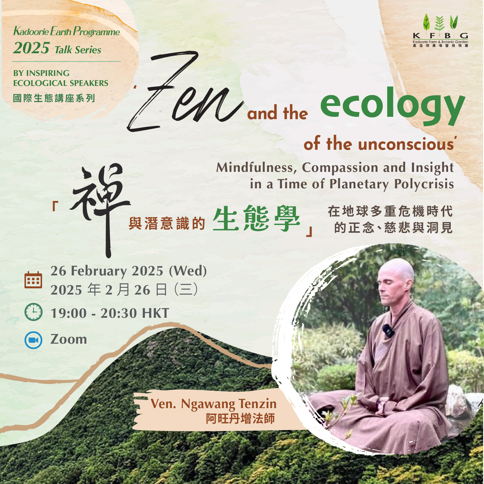 在這次與丹增法師(Ven. Tenzin)的線上講座中,他將會分享自己的親身經歷——從研究氣候變化對雨林生物多樣性影響的生態學家轉變為禪修者,並就相關的議題與聽眾展開探討。他將討論我們的五感、思維與潛意識(或在大乘佛教傳統中例如禪宗和藏傳佛教所理解的「阿賴耶識」)之間的關係。他將闡述這種儲藏意識的模式如何在實際中應用於深層療癒。無論是在個人還是集體層面,使我們都能夠採取行動做出正面的改變。
