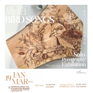 是次展覽將展出以澳洲和香港鳥類為題的烙畫作品,藉鳥類的棲息環境限制下的不可能相遇,帶出移民潮下身份認同的探索,亦喚起大眾對雀鳥保育和認知。展期間,於25 Jan 2025 ( 15:30-16:30 ),藝術家將與香港觀鳥會舉辦分享會,敬請留意!