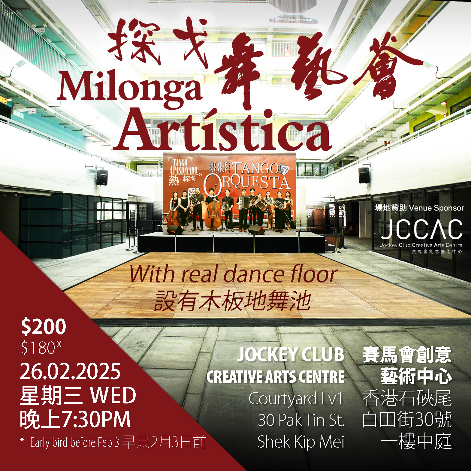 可能是香港最致力於正宗阿根廷音樂的樂團 - 正式發表第一個Milonga舞會!!是次活動分為舞者區(設置正規舞池木地板)和純聽音樂區,也為所有參與者準備茶點。 以12人樂隊編制演出7 個tanda,於香港最具活力的創意藝術中心之一的JCCAC藝術氛圍中,伴隨著Anibal Triolo, Carlos Di Sarli, Fabio Hager, Juan d'Arienzo, Astor Piazzolla等名作曲家、名樂隊領班的音樂。