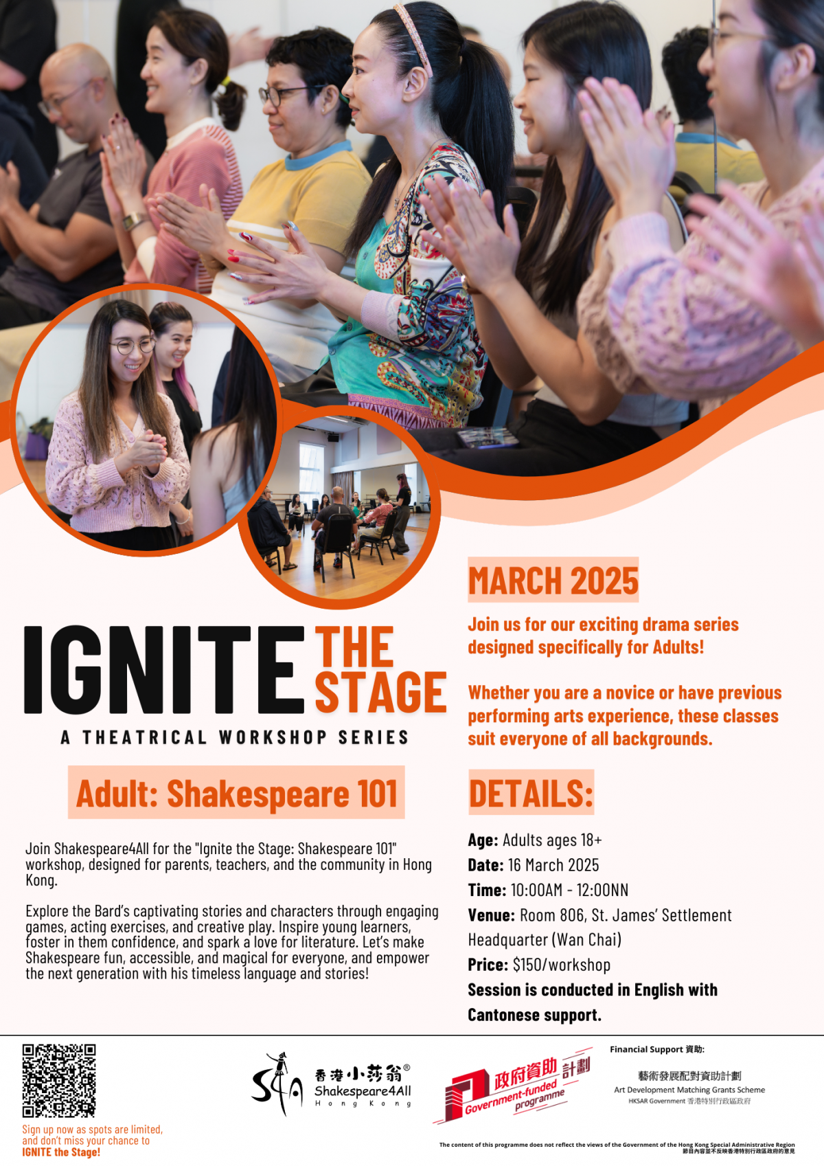 歡迎參加香港小莎翁呈獻「燃亮舞台:莎士比亞入門成人工作坊」!此工作坊專為希望踏入莎士比亞話劇世界的香港家長和教師而設!