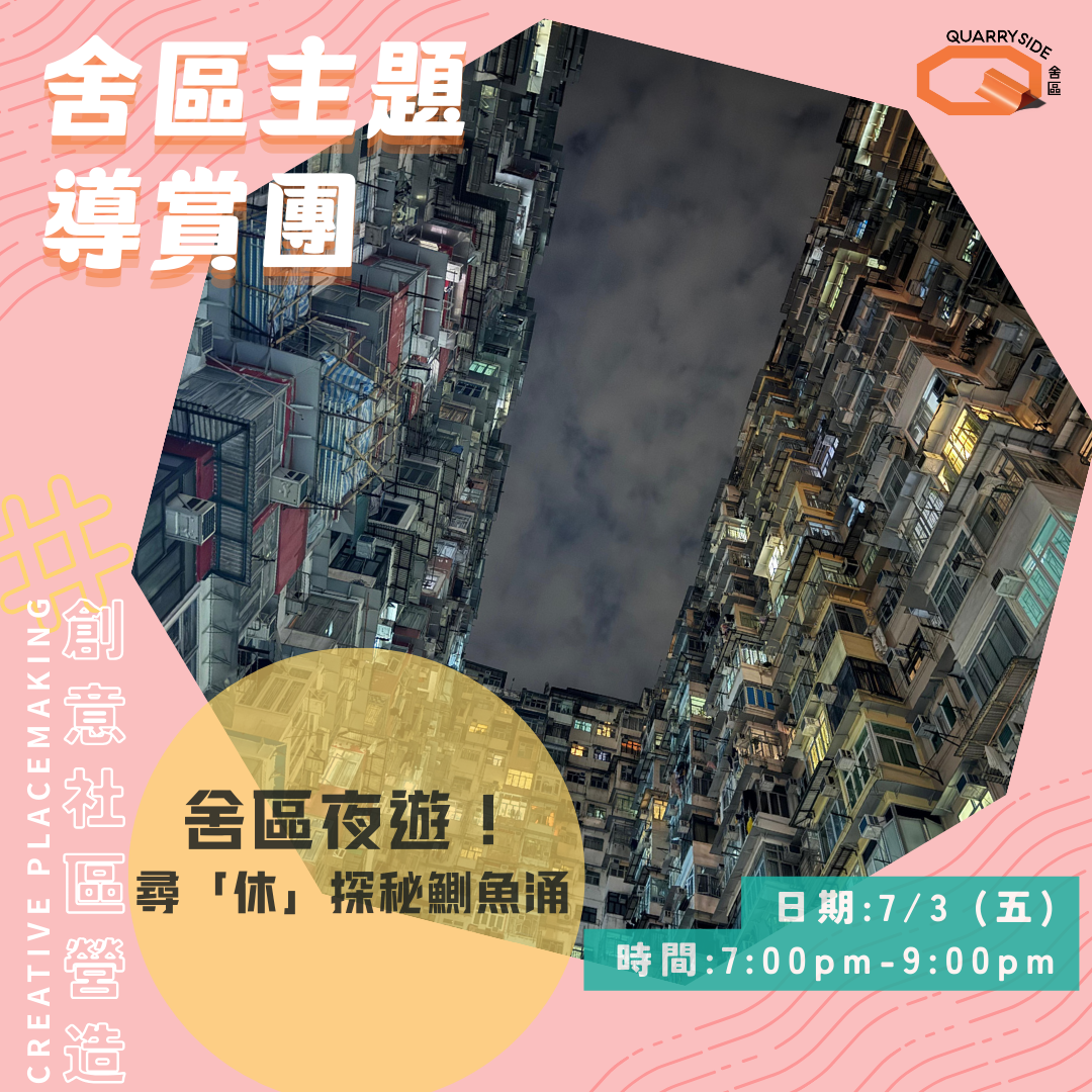舍區導賞團首次舉行城市夜遊,一齊喺夜空下尋「休」探秘,探索鰂魚涌及太古一帶嘅寧靜及秘密,了解休憩空間與城市發展之間嘅關係,開拓大家嘅城市想像。