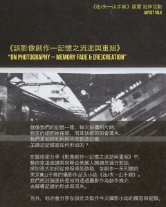 在藝術家分享《談影像創作——記憶之流逝與重組》中,藝術家張俊謙將與聯合策展人陳韻芝進行對談,探討張氏如何從旅程得到啓發,並創作一系列關於東京JR山手線的攝影作品及小誌《迷/失 — 山手線》。我們將討論張氏是如何透過攝影作為創作媒介,去解構記憶的形成與流失。另外,他亦會分享在設計及製作今次攝影小誌的構思與經驗。