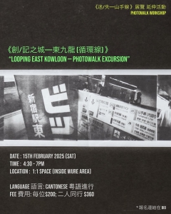 是次攝影工作坊將以展覽《迷/失——山手線》作為藍本及靈感,讓參加者展開一場「東九龍攝影小旅行」。創作者 Jeremy 首先會在展覽空間進行簡短導賞介紹,然後將帶領參加者集體沿著預先規劃的路線,步行並乘坐交通工具進行「快閃拍攝」,從而建構屬於自己的圖輯。最後,大家會在展覽空間內重新聚集,回顧並分享透過影像所捕捉到的旅程印象。