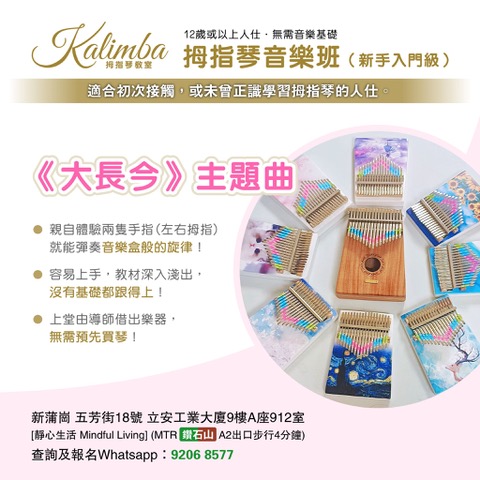 .適合初次接觸,或未曾正識學習拇指琴的人仕! .親自體驗兩隻手指 ( 左右拇指 ) 就能彈奏音樂盒般的旋律! .選段學習兩種彈法,教材深入淺出,沒有基礎都跟得上! .無需預先買琴,上堂由導師借出樂器! .訓練左右腦與身體協調! .容易上手,非常適合都市人學習!