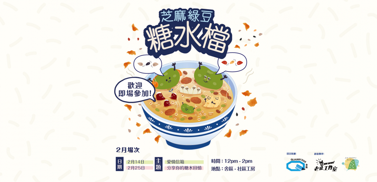 舍區與老正工作室「不如問阿婆」合作,於2至5月午膳時間舉辦「芝麻綠豆糖水檔」。早前招募16位銀齡Mr Bean & Ms Sesame,經過一連串培訓成為「糖水擔當」,每位經已準備好與大家分享自煮糖水,邊食邊傾人生的芝麻綠豆瑣碎事情。
