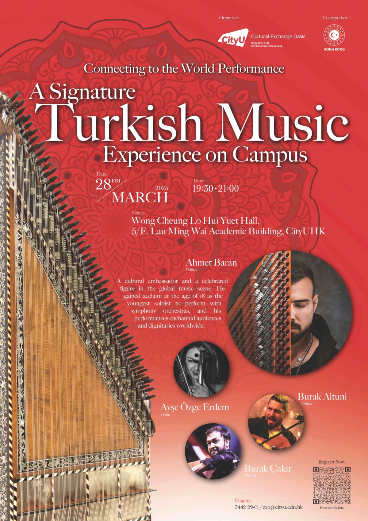 在這個春意盎然之夜,文化薈為您獻上一場難忘的音樂盛會!讓我們一起:• 沉醉於國際知名音樂家Ahmet Baran及其樂團帶來的傳統「卡農琴」美妙旋律中;• 透過音樂,探索歐亞交匯的豐富文化底蘊;• 見證傳統與現代土耳其文化融合的獨特魅力。樂團將以精湛的技藝,巧妙地詮釋土耳其傳統音樂,並融入現代藝術的創新元素,為您打造一場不容錯過的文化之旅,感受音樂跨越國界的靈魂共鳴!