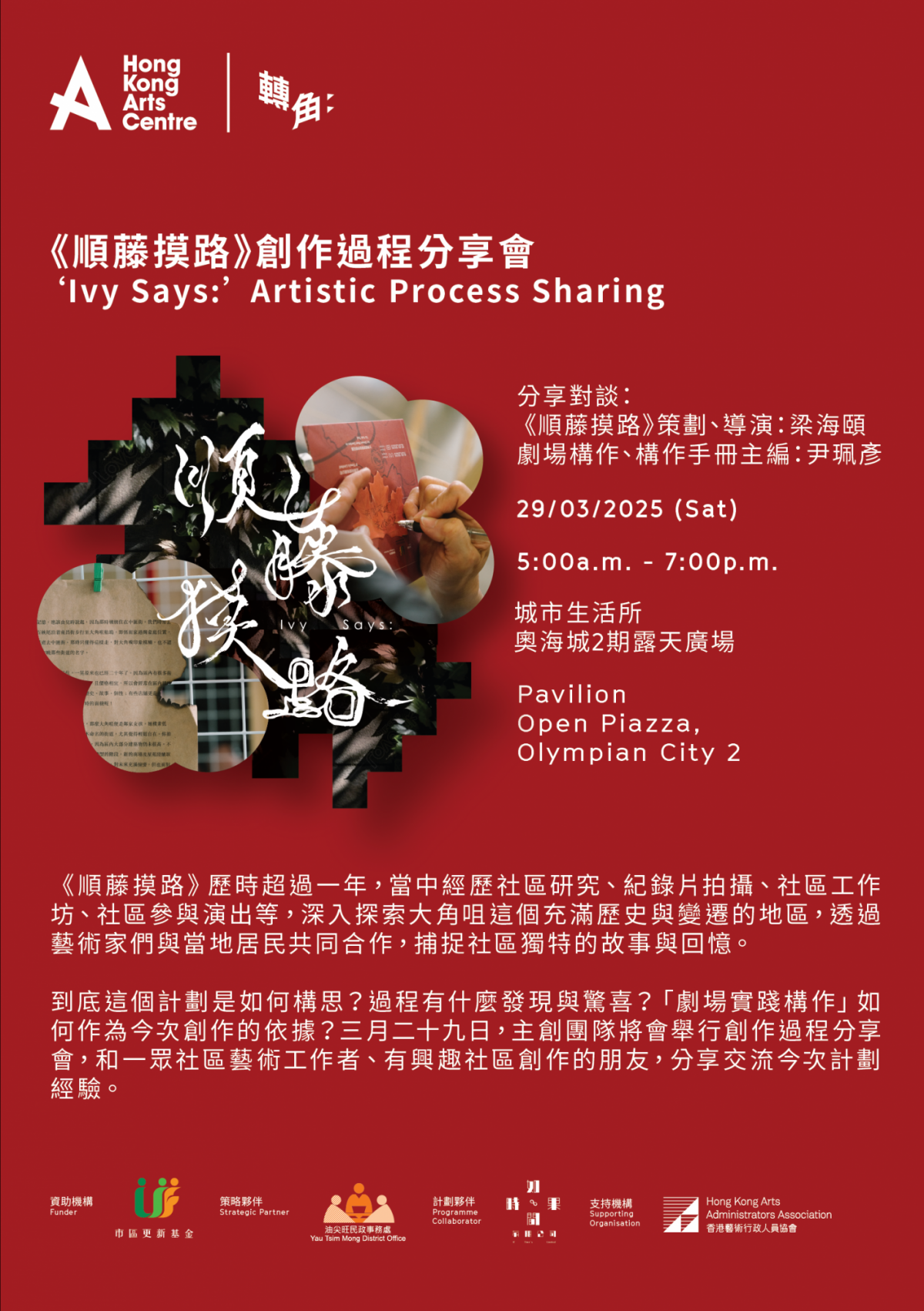 亦會發佈「呼.應 - 實踐構作與社區表演藝術《順藤摸路》」構作手冊,並放映社區人物的紀錄片及演出精華片段。我們期望以這個計劃經驗作為引子,打開對話,共同思考社區表演藝術的未來可能性。