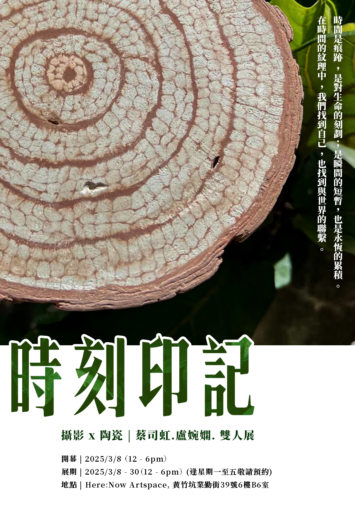哲學家柏格森 Henri Bergson 曾說,時間並非一連串可切割的瞬間,而是一種「持續」(durée) —— 一種內在的流動,不斷累積、交織,塑造我們的記憶與存在。展覽 《時刻印記》,藝術家蔡司虹與盧婉嫻透過攝影與陶瓷,將時間具象化,讓我們在細微的紋理與痕跡中,感受時間的形態。