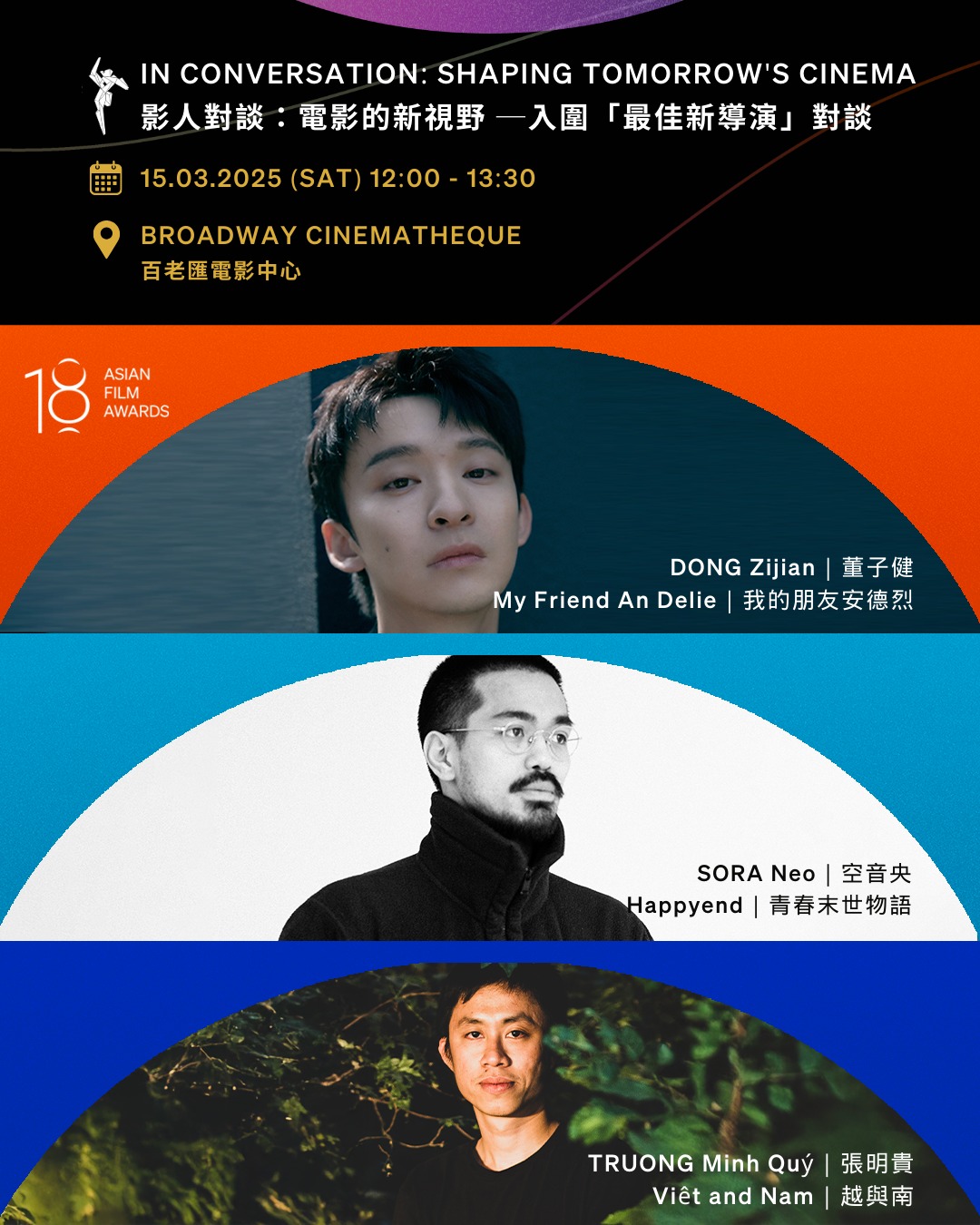 本屆「最佳新導演」入圍者——《青春末世物語》空音央(日本)、《我的朋友安德烈》董子健(中國大陸)及《越與南》張明貴(越南),將於《電影新視野》對談活動中,分享如何以嶄新的風格與視角拓展電影的可能性。
