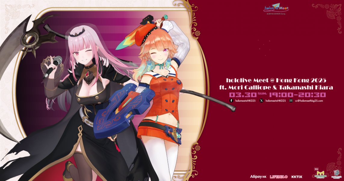 將hololive的聲音傳到世界!「hololive Meet」作為結合hololive 旗下所有團體的共同項目企劃,在世界各地的海外活動舉辦多場精彩的演出,並獲得好評,既台北之後,香港將成為第二個獨立舉辦的城市,將為各位本地粉絲帶來更多精彩的演出!此次帶來,來自 hololive English -Myth-的成員 「Mori Calliope」與「Takanashi Kiara」!!