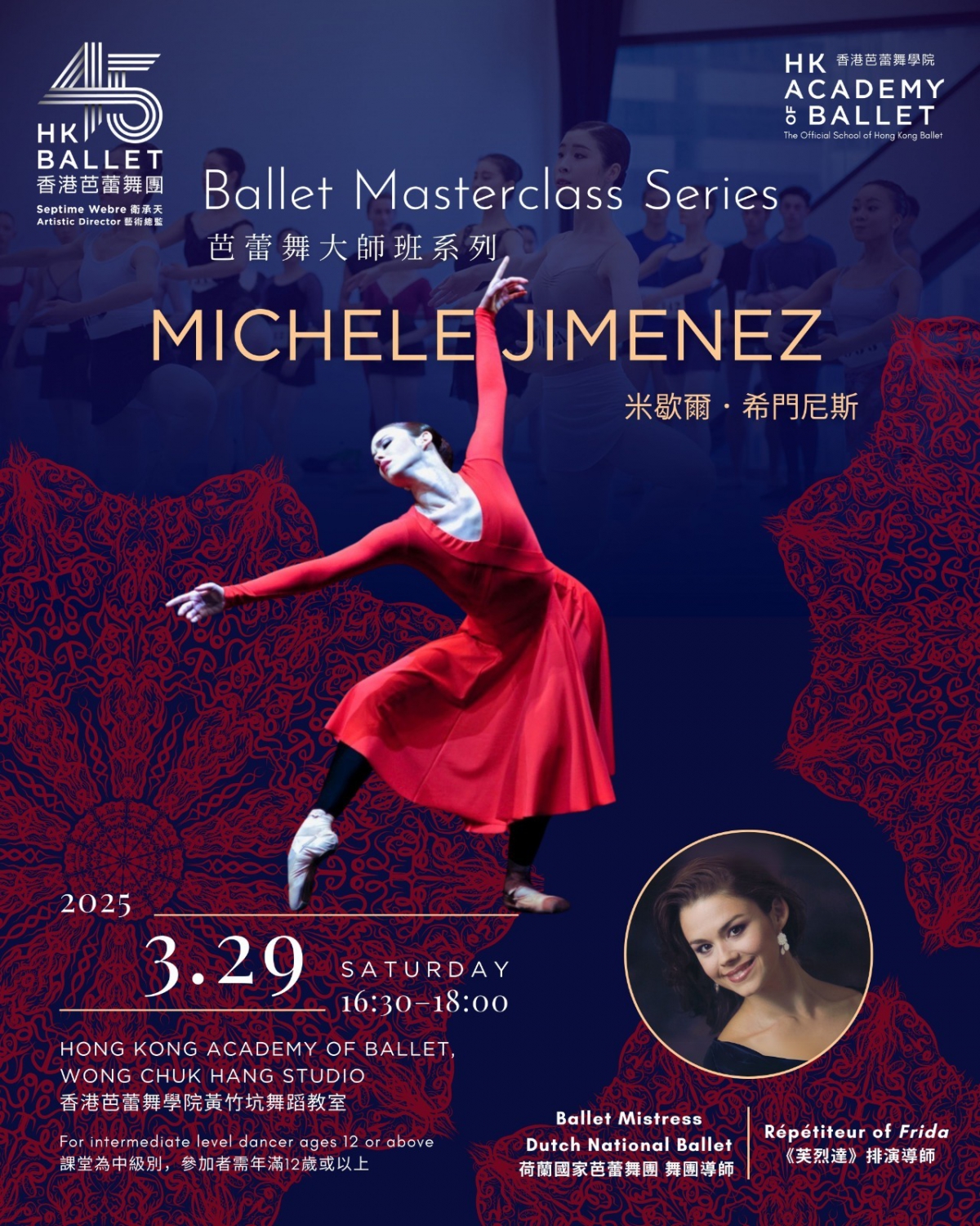 米歇爾·希門尼斯 (前荷蘭國家芭蕾舞團首席舞者、華盛頓芭蕾舞團導師)將於 3 月 29 日在香港芭蕾舞學院大師班。希門尼斯為港芭於 4月份演出的《芙烈達》作排演導師。是次大師班希望讓學員深入鍛鍊古典芭蕾舞技巧。機會難逢,請大家踴躍參加!