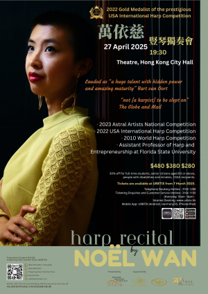 華裔美國豎琴家萬依慈Noël Wan ,16 歲時於烏得勒支交響樂團首次亮相,是一位廣受讚譽的國際豎琴獨奏家。演出足跡含括美國卡內基音樂廳、Yellow Barn Summer Festival 、荷蘭 Muziekgebouw 音樂廳及亞洲各地等。 2022 年始,任教於佛羅里達州立大學,擔任豎琴和創業助理教授,並在世界各地舉辦大師班。 Noël Wan 於 2023 年榮獲 Astral Artists National Competition 全美比賽冠軍。榮獲樂界響富盛名的美國國際豎琴大賽USA International Harp Competition 金牌,此為世界上最負盛名的豎琴比賽之一;亦是世界豎琴大賽 World Harp Competition 史上最年輕的一等獎得主。