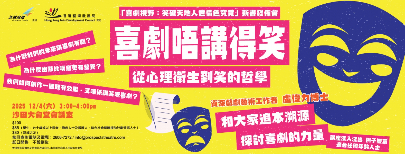 為什麼我們的未來跟喜劇有關?為什麼幽默比嘆息更有營養?我們如何創作一個既有效果,又唔係講笑嘅喜劇?資深戲劇藝術工作者盧偉力博士,和大家追本溯源,探討喜劇的力量。講座深入淺出,例子豐富,適合任何年齡人士。**首10位參加者, 可得「喜劇視野:笑破天地人世情色究竟」新書一本**