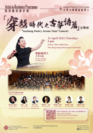 香港理工大學(理大)「駐校藝術家計劃」至今一直深受理大社群歡迎。理大每年都邀請來自不同藝術範疇的頂尖藝術家,通過親身指導、直接交流及對話,以及同台演出,提升了理大社群的藝術文化素養。本年度,在古箏大師鄒博士的帶領下,除了個人獨奏,鄒博士更將與多位特邀藝術家、理大校友會聯會中樂團,以及理大中樂愛好者聯袂演奏,呈現一系列多樣化的曲目。這場音樂會將以古箏為主體,展現古曲、現代曲、西方音樂、時代曲等組成的穿越古今中外的精彩表演。
