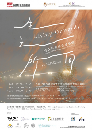 「生之所向 Living Onwards」為香港華人基督教聯會廣蔭頤養院(綜合安老服務)「生死有匙」項目成果展,透過一年的創作工作坊,以不同媒介,嘗試湊合長者與年輕人,跨越年齡的鴻溝,一同反思生命與死亡的種種,整理、翻開我們未曾宣之於口、未曾好好細嚐的人生故事。當樹木朽壞、雨水蒸發,讓我們捧一把,好好凝視,好好安頓。